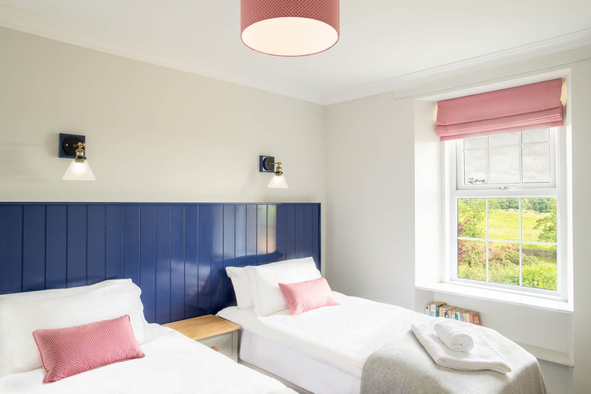 Immersed in floral beauty and overlooking the rich greenness of our Scottish countryside, a cosy invitation awaits you. The downstairs double bedroom has an en-suite shower room and the two further upstairs bedrooms benefit from a shared bathroom, with all double beds able to be set up as twins.